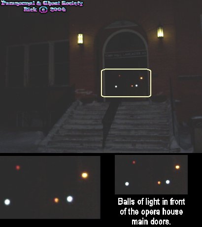 I always feel something on the property here perhaps its because tragedies did occur around the opera house grounds itself. I captured ectoplasm and entities on all sides of the opera house. There were a few areas which seemed to be active here the front stair well, the main sign, the clock tower where a man supposedly hung himself, the back door, and the emergency escape stairs which I walked about half-way up on.
