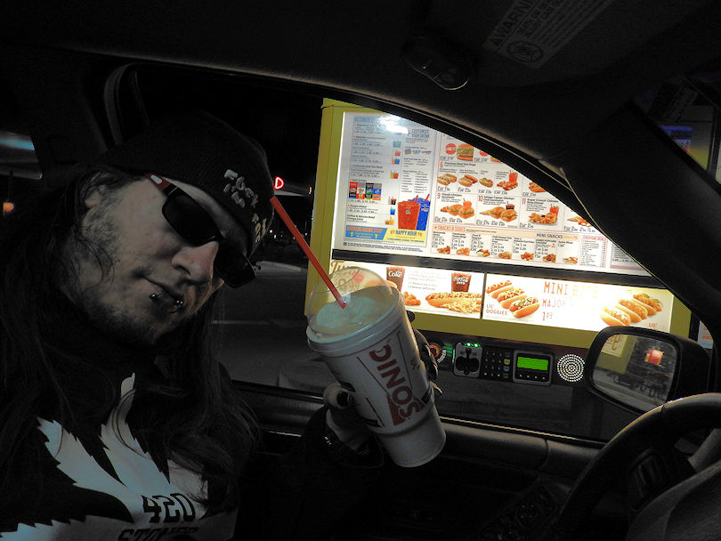 I was still pretty hungry after spending the day up in La Plata, Mountain Well, Dixie Valley and eventually Middlegate Station. So seeing this Sonic's while journeying home at night forced a stop to pick up a dark chocolate fudge shake and a foot long Coney dog! |