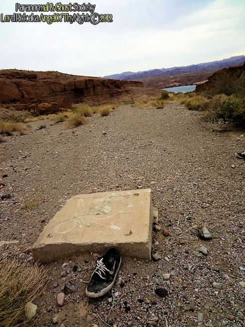 A shoe resides at the base of Nelsons Landing kind of eerie. Back in the day from a private source I recieved information that many of Nevadas missing persons have been buried out here. At times finding shoes and articles of clothing does not mean someone was murdered but it is nonetheless a bit of an odd find.  This is the site where many lost their lives in a flash flood. Hell Hounds no ghosts here are however quite the possibility.