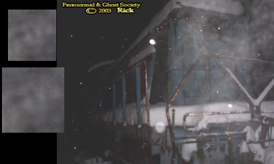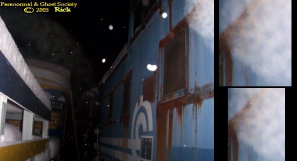 We then came across 2 cabooses. One was a Conrail and the other had no name. These may have been more haunted then the train itself. Mark heard tapping and noises in the one caboose. I felt watched from both of them and you could feel that they were abnormally colder then even outside. We then came across a few engines B&O railroad and some unknown types. I caught some ectoplasm up near the engine itself. Then we decided to head our long walk back down the other side of the tracks to explore some more passenger cars.