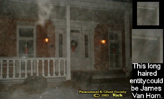 We walked up to the mansion and right away I felt watched by many entities perhaps more or less like they were over joyed to see me. I must have taken at least 12 apparition photos in a row just on the front porch area. Then I proceeded to look in the windows admire the old wood work and lit Christmas Tree. It looked so cozy inside I thought about hot chocolate and a nice warm room to spend the night here but then I woke and said hey wait a second I got investigating to do haha.