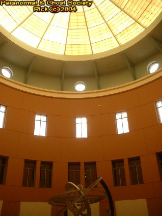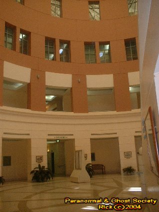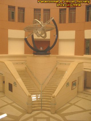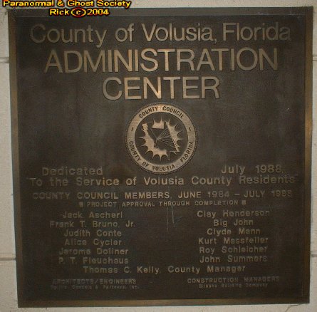 The Thomas C. Kelly Building or known as the Volusia County Administrations Center was erected in 1988. Now i could be wrong however the buildings plaque did state this. What makes perhaps this place so unique is that it is one of the newest and largest buildings here in Deland. But it also sits between quite a few other haunted locations I have investigated. But this is more then just a government building outside is the Veterans Plaza for those that perished in the Korean War, then a picnicking area, also walkways with many benches just to sit relax read a newspaper. The giant fountains in front are always bursting with water and there is a real comfort level just to take a stroll on the grounds. Thomas C. Kelly was the first county manager in Volusia. He served the citizens from May of 1971 all the way up until his retirement in August of 1994. The building is a symbol of his leadership and his hard work threw the years he served the county. On July 27th 1995 the Volusia County Council decided on this building becoming the Thomas C. Kelly building. But perhaps it is the beauty that inspired me to investigate such a place like this when you walk inside its more like a museum as paintings depict some of Volusia Counties History, Marble Floors, and a monolithic sculpture of the Solar System. In the main lobby there is an a 4 floor vaulted ceiling where the sun beams down onto the Sculpture, Stairwell as you can look up and see many offices surrounding the lobby in a spherical shape. But the building has a sort of Greek Architecture to it quite rare for a DeLand Landmark. Unlike many places visited this one has alot of energy you can just feel it its all over and a lot of orbs we captured were very large in size and transparent. My son has claimed to see multiple ghost here walking around going about there business so perhaps it is the land that is haunted just as if someone built up Ground Zero in NYC. But this is more then just a place for permits, taxes, census, tags, animal control and more. This is a also a place where the supernatural exist. Of course why wouldn't it after all we often expect to see ghost just at cemeteries but what about government buildings, offices or places of business? We will return for a second investigation for a more in depth investigation of the ghost of this grand building. © By Rick-AngelOfThyNight |