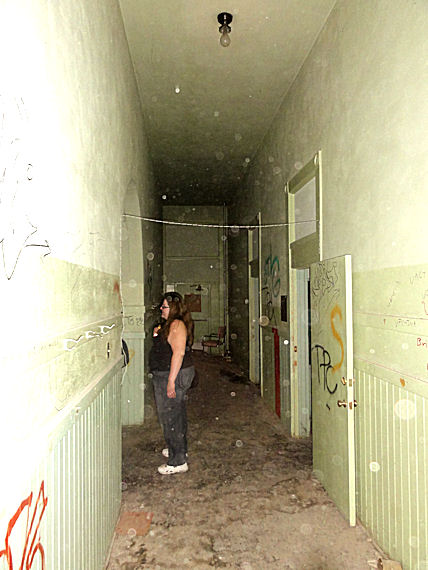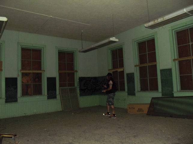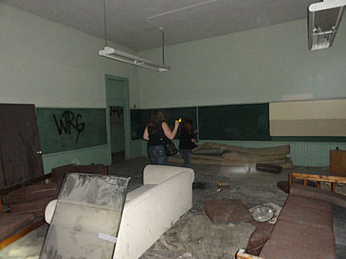 Whether the school is haunted or not it truly is hard to say at night it looks like one of the most intimidated buildings your ever going to confront. However inside it is what it is just an old school house. Unfortunately the building is in deplorable condition overran by rodents and pigeons. Their is also allot of graffiti on the chalk boards, stacks of furniture, holes in the walls, lights hanging by a thread and inches of pigeon droppings upstairs. One of the rooms you can see animal prints in as if someone brought their dog inside to walk around its quite the site.