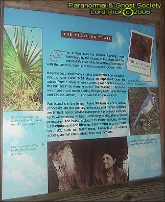 Much of the area contains more sand pine scrub then anywhere else in the world Throughout the area is fertile soils and moisture which supported growth of longleaf pines, wiregrass, turkey oaks, and other exotic plants. The early pioneers called these areas islands because of the sea of scrub that surrounded them. The Reuben Long Family came to the area about 1872 and related family members were granted homestead acres they applied for here. They live off the land surrounding the Yearling Trail for many years. Eventually that grew in the late 1800s to about 12 different families living on the 1400 acre island. They would farm, raise cattle, hogs, hut, fish, making moonshine whisky, and travel with other boats on the near by St. Johns River. Eventually the community developed its own church, school, post office, and self appointed ministers The area was so unique due to the island being surrounded by scrub pine that it was isolated from the rest of other Florida settlements. Unfortunately in 1894 and 1894 Florida had some big freezes after that the settlement started to disperse. Most of the settlers sold or leased their homesteads before the Ocala Forest was formed in 1908. The outside forces were bring life to end on the island. Then by 1935 the island completely became abandoned. Today its very overgrown full of very narrow trails and remnants. Marjorie Kinnan Rawlings an author was very fascinated with the island and its inhabitants She stayed with Calvin and Mary Long in 1933 perhaps visiting for about a month. She also visited the area many times journalizing many of the stories the Longs told. Calvin's childhood story of nursing a deer from a fawn gave her the idea to write the novel called "The Yearling" which won a pullitzer prize The book was made into a movie starring Gregory Peck, Jane Wyman and Claude Jarman Jr. and was filmed in this location in the 1940s. There is one story about the Baxter Homestead where Jody breaks away from his chores to build a flutter mill at Silver Glenn Springs. Then there is a story about a bear hunt that took place in Hopkins Prairie with Jody and Penny. As the island remained forgotten the prairies started to consume it. You can still see the different sites where residents lived along the trail. One of those sites in the Long Cemetery which will eventually be a separate investigation. But also we seen on one of the islands an abandoned campground, a stone stairwell, a swamp, a lake, and other signs that humans once inhabited the area. There are remains of the homesteads as well but due to it being summer everything is overgrown so we probably will not find them unless we either go in the winter or wander off the trails. Speaking of wandering off the trails this area is very secluded might even say dangerous. Our first investigation the trail was not marked in all areas and we did get lost. Sad to say that some of the trails dead end and next ya know your walking in tall wet grass or in the middle of the Ocala Forest. There is also dozens of dirt roads some are closed off by wood to keep cars out. We actually did hike threw a few areas such as the Pat's Island area, Hopkins Prairie and Near Juniper Springs The whole area makes up a few thousand acres. There is also alot of Saw Palmetto and thick brush which can cut you up very quickly. So I guess what I am saying is that this is the type of place that took alot of outdoors experience. But that is why I chose it cause if you were a bigfoot where would you hide? This area would be suitable for Cryptids, Ufos, spirits from the ghost town etc due to its seclusion and habitat. Some of the sites that can be seen along the trail is an old cattle dip dating back to the 1920s. Then there is Grahamville Road or Jody's Trace. There is also a giant sinkhole where the residents got there drinking water from. Then there is a homesite of Patrick Smith. Another dirt road that runs threw here is the Major Churchhill Road which leads to the Florida Scenic Trail which cuts down threw Ocala Forest. The area which also had a forest fire has an old dog wood tree one of the oldest in the area. Its very gnarled and somehow escaped many forest fires. Then there is the homesite of Reuben and Sara Long who are buried in the cemetery. The Yearling was filmed mainly at the Calvin Long Homesite which today still is in the woods probably buried by brush. Lastly there is the largest cedar tree on Pat's Island it was used to mark the homesite of Calvin Long's daughter Cara and her family. So lots to see how here and visit its a pretty interesting little area which makes it exciting to make discoveries. © By Rick-LordOfThyNight