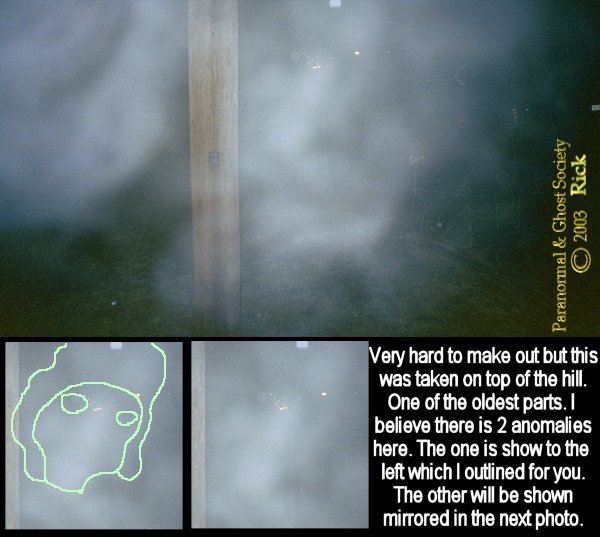 vine walls as soon as I hit the ground I could feel I was not alone. I walked over to some stones near the tracks running along the west end of the cemetery right away I heard a bang on a tree it sounded like someone picked up a piece of wood and banged it against a tree pretty close by I then pursued my walk through the cemetery going deeper in. It was quiet however I did seem to notice often hearing footsteps on its gravel roads and in the mud. The cemetery still had