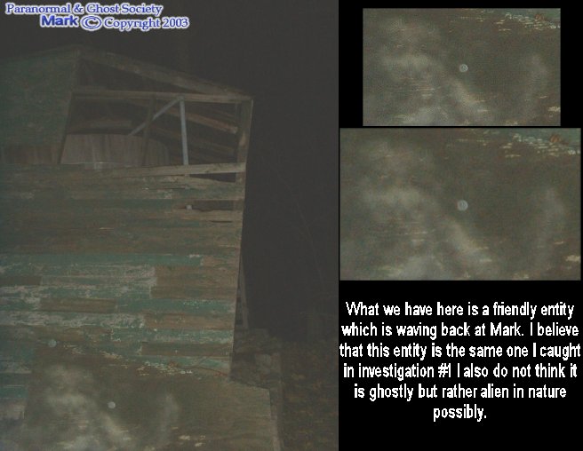 Mark and I walked to a tire swing and yes I did ask another entity to play on the swing and although I did not capture it on the swing I did get it one next to it and that pretty much made my night complete. Upon saying goodbye I captured another entity looks like it might be waving to me and Mark also got a nice goodbye photo to take home to everybody.