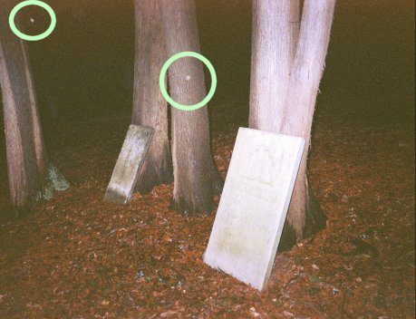 It was a warm night...50 degrees, balmy, so that would rule out any "fog" The group split up in the cemetery, and each got his or her own pictures. You could feel cold spots, and that is where I took my pictures. I captured an orb, and a ghostly form or two right next to a tombstone. My camera died just as we were about to leave. Rick has mentioned before that ghosts will drain your batteries, so you always need to carry extra!