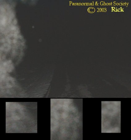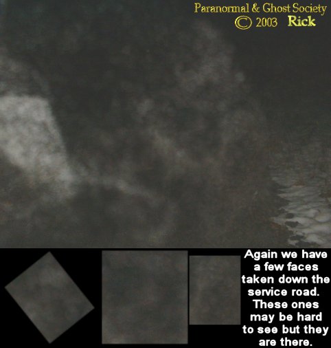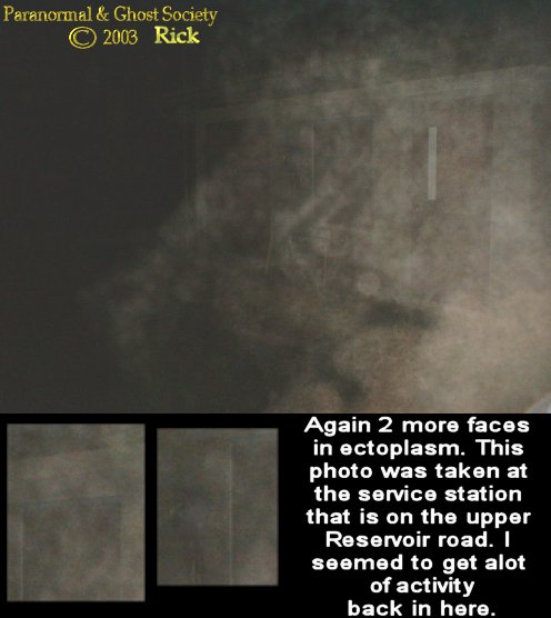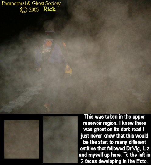 We ate and then headed off to walk along the upper reservoir the area where there were mutilated animals and other things spotted up in here. We got out and walked around it half way. This time it did not feel so bad to walk at night although it was dark to a point of we almost could not see a hand in front of our face. At times I stayed behind Liz and Dr Vig and captured many apparitions walking with us. I believe 10 straight ectoplasm shots as we walked down the road. Whatever it was it kept following us because I would turn around real quick and capture ectoplasm then wait and it would be in front of us.